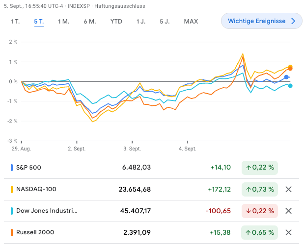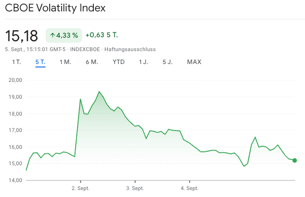 Der VIX notiert aktuell bei 15,18 Punkten, ein Anstieg von rund +4,3 % gegenüber der Vorwoche. Spannend ist vor allem der Spike direkt zum Wochenbeginn. Nach dem Labor-Day-Wochenende schoss der VIX zeitweise bis knapp unter die 19er-Marke. Auslöser waren vor allem die schwachen ISM-Manufacturing-Daten, sowie zusätzliche Unsicherheit durch ein Gerichtsurteil im Zusammenhang mit den Trump-Zöllen.
