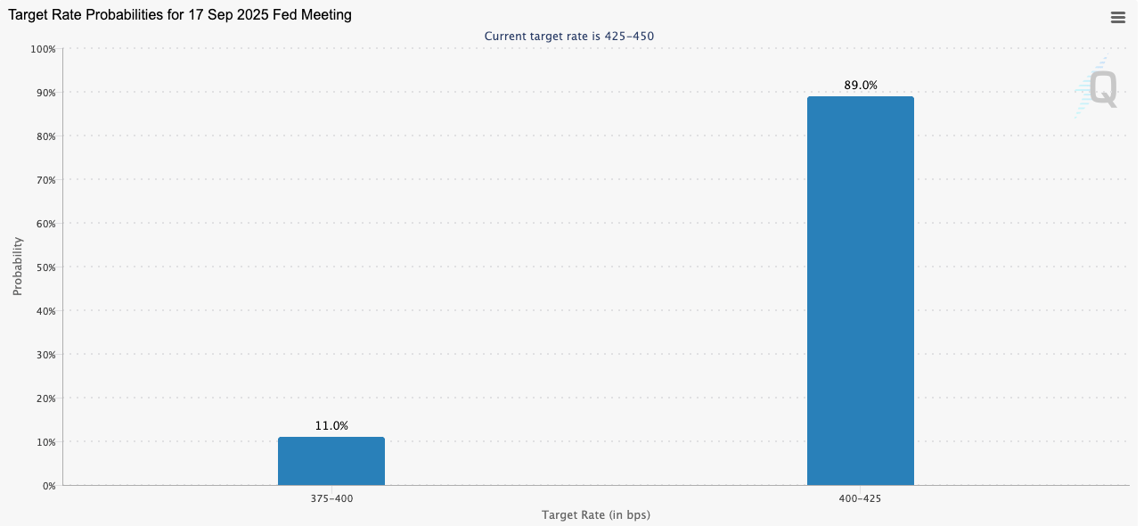Das nächste FOMC-Meeting rückt immer näher und am 17. September wird die FED ihre Entscheidung zum nächsten Zinskurs verkünden. Nach den schwachen US-Arbeitsmarktdaten (höhere Arbeitslosenquote) ist die Erwartung an eine Zinssenkung nochmal deutlich angesprungen. Die Wahrscheinlichkeit für einen Ratecut liegt aktuell bei 100 %, nachdem sie letzte Woche bereits von 75 % auf 86 % hochgesprungen war. Neben den einfachen 0.25 Basispunkten rechnen sogar 11 % der Stimmen mit einer “doppelten” Zinssenkung auf einen Korridor von 375-400 BPS.