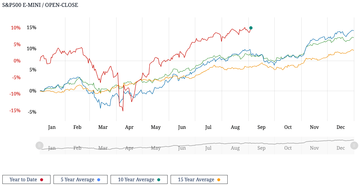 Der S&P 500 liegt Year-to-Date aktuell rund +12 % im Plus (rote Linie) und damit klar über dem 5-, 10- und 15-Jahres-Durchschnitt. Wir sehen also erneut ein Jahr, das deutlich stärker läuft als das historische Mittel.