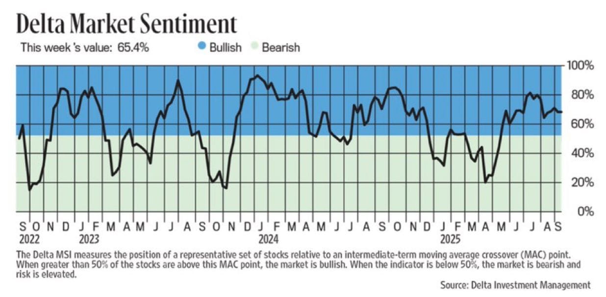 Der Delta Market Sentiment Index liegt aktuell bei 65,4 % und damit im bullischen Bereich. Rund zwei Drittel der Aktien handeln oberhalb ihres mittelfristigen Moving Average, die breite Marktteilnahme ist also, wie auch die Saisonalität zeigt, nach wie vor intakt ist. Schaut man sich den Verlauf an, sehen wir, dass das Sentiment in diesem Jahr bereits mehrere Male zwischen Bullen- und Bärenzone gependelt ist. Nach den Einbrüchen im Frühjahr hat sich das Bild aber stabilisiert und bleibt seit Monaten überwiegend bullisch. Ein Wert von über 60 % signalisiert, dass nicht nur einzelne Schwergewichte den Markt treiben, sondern eine breite Basis an Aktien mitzieht. Genau das stärkt die Rally.