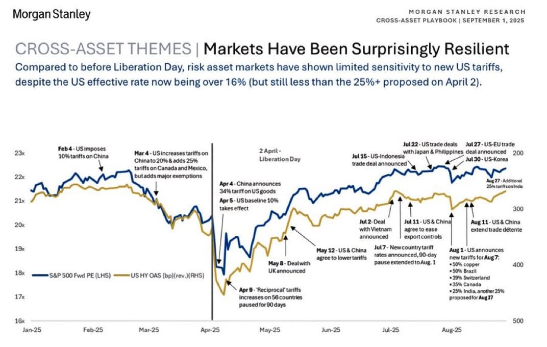Die Grafik von Morgan Stanley zeigt eindrucksvoll, wie robust sich die Märkte trotz der Handelsstreitigkeiten und der ganzen Welle an neuen Zöllen gehalten haben.