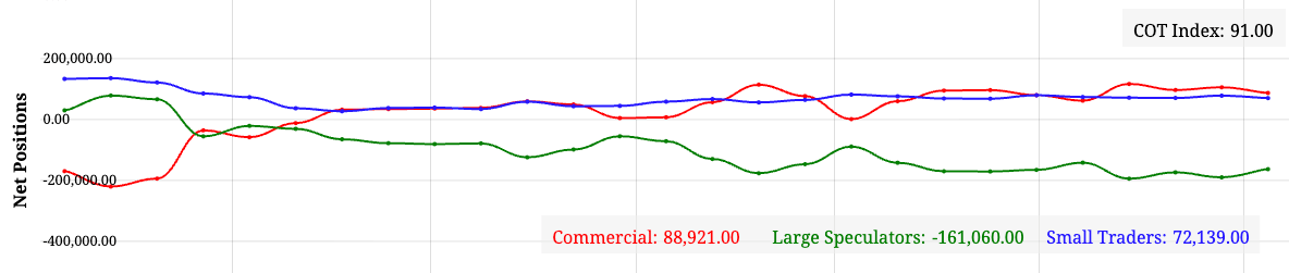 In dieser Woche haben die Commercials ihre Long-Positionen auf 88.921 Kontrakte reduziert (Vorwoche: 107k). Das „Smart Money“ bleibt also weiterhin auf der Kaufseite, allerdings mit einer etwas geringeren Gewichtung. Das zeigt, dass die Institutionen nach wie vor an der Rally partizipieren möchte, sich dabei defensiver aufstellen.