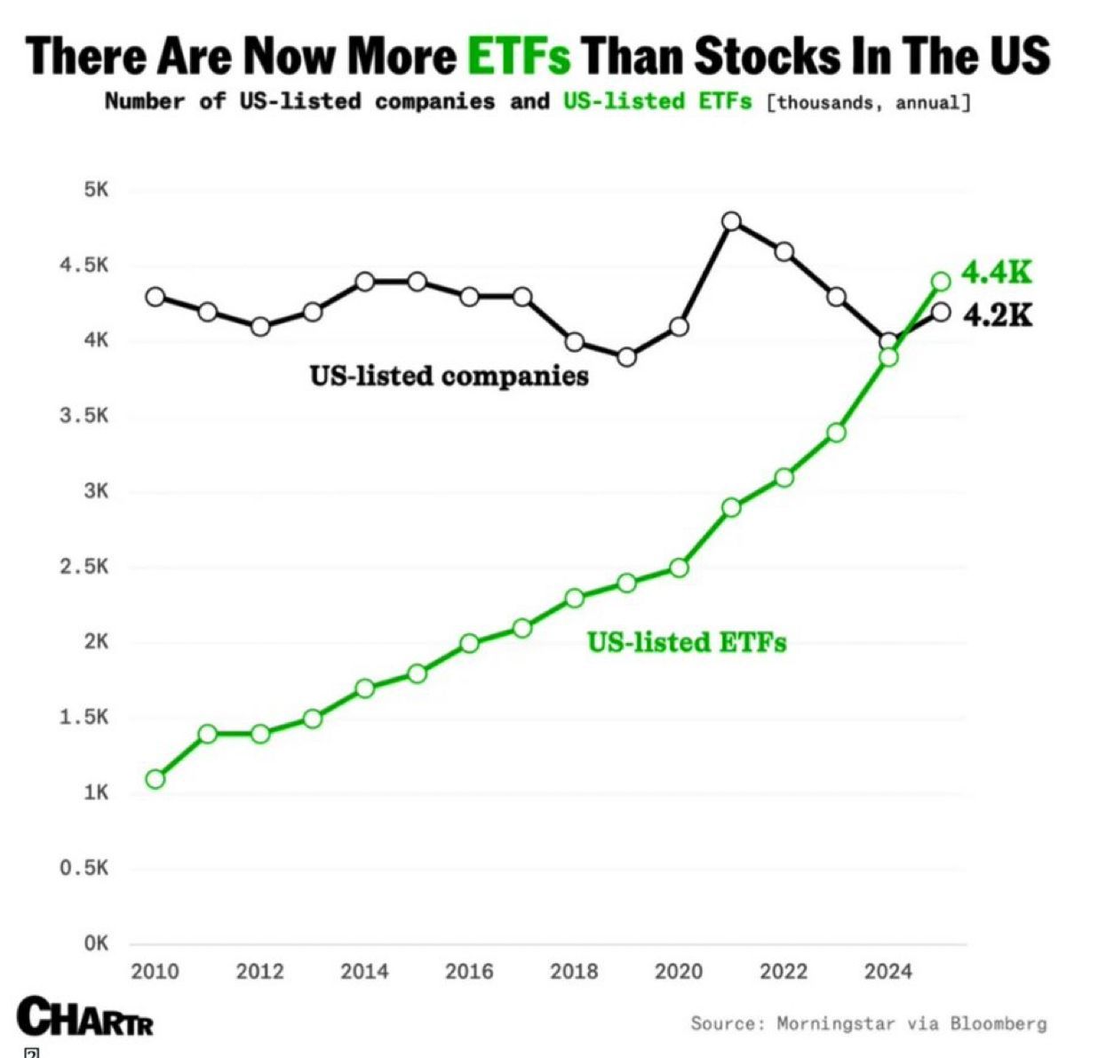 In den USA gibt es mittlerweile mehr ETFs als börsennotierte Einzelunternehmen. Rund 4.400 ETFs stehen aktuell 4.200 gelisteten Firmen gegenüber. Noch vor gut zehn Jahren lag die Zahl der ETFs bei etwas über 1.000, während die Zahl der Unternehmen über den gesamten Zeitraum hinweg relativ stabil blieb und zuletzt sogar leicht rückläufig war. Das zeigt uns sehr interessant wohin die Tendenz auch in Zukunft geht: Retail-Investoren greifen immer stärker zu Index- und Themenfonds, anstatt gezielt in Einzelaktien zu investieren. Das hat weitreichende Folgen. Zum einen fließt immer mehr Kapital in die großen Indizes, was die Kursentwicklung der dort enthaltenen Schwergewichte zusätzlich verstärkt. Zum anderen geraten kleinere Unternehmen zunehmend ins Abseits, weil sie schlicht nicht im Fokus dieser Geld-Ströme liegen.
