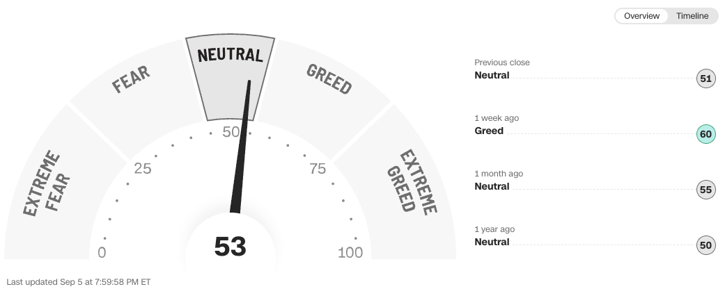 Der Fear & Greed Index steht aktuell bei 53 Punkten und signalisiert damit ein neutrales Sentiment im Markt. Gegenüber letzter Woche (60, also „Gier“) hat sich die Stimmung deutlich abgekühlt. Vor einem Monat lagen wir ähnlich (55, neutral), und auch im Jahresvergleich zeigt sich ein fast identisches Bild (50, neutral).