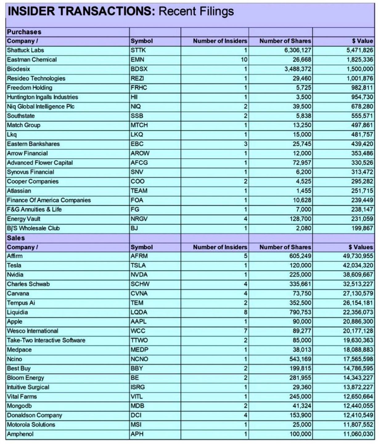 Auf der Kaufseite bleibt das Bild wie schon in den Vorwochen eher dünn. Zwar gab es größere Transaktionen bei Eastman Chemical (EMN) mit rund 1,8 Mio. USD und bei Shattuck Labs (STTK) über 5,4 Mio. USD, insgesamt sind das aber keine Schwergewichte für den Gesamtmarkt. Die restlichen Käufe verteilen sich stark auf kleinere Titel und Nischenwerte, also wenig Relevanz für den breiten Markt.