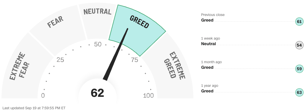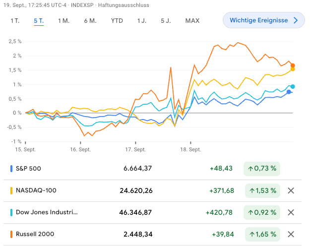 Damit sind wir auch für diese Woche am Ende des GREY BRIEFING angekommen. Die Märkte haben mit der Zinssenkung der FED ein starkes Signal erhalten, neue All-Time-Highs quer über S&P, Nasdaq, Dow und sogar beim Russell 2000 sprechen eine klare Sprache. Die FED-Watch beflügelt die nächste Zinssenkung. Gleichzeitig zieht das Sentiment spürbar in Richtung „Greed“ und die Volatilität steigt leicht an.