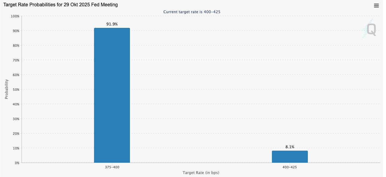 Spannend ist auch ein Blick auf das FedWatch Tool der CME. Dort wird nach der jüngsten Zinssenkung bereits mit einer Wahrscheinlichkeit von 91,9 % davon ausgegangen, dass die Fed am 29. Oktober direkt den nächsten Schritt macht und die Zinsen erneut senkt. Nur 8,1 % der Marktteilnehmer rechnen damit, dass die Spanne von aktuell 4,00–4,25 % unverändert bleibt.