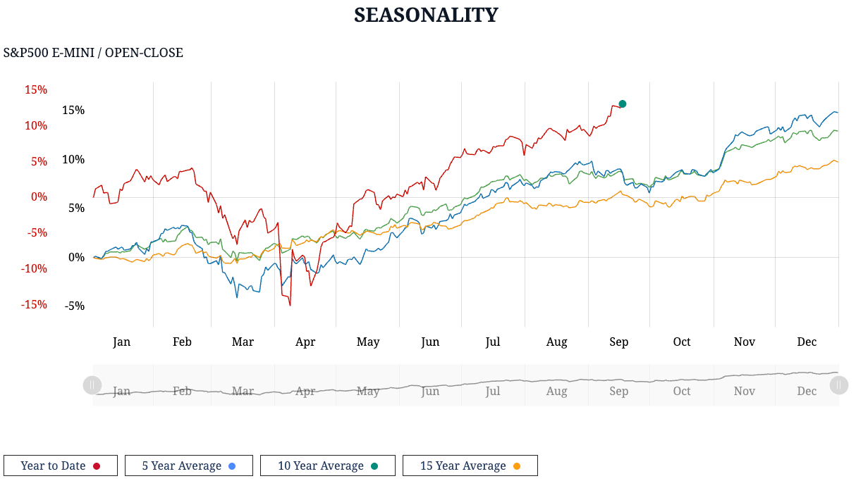 Aktuell liegt der S&P 500 mit einem Year-to-Date-Plus von rund 15 % deutlich über den saisonalen Durchschnitten der letzten 5, 10 und 15 Jahre. Während die Durchschnittsreihen im September meist eher seitwärts bis leicht schwächer tendieren, hält sich der Markt in diesem Jahr klar oberhalb der historischen Muster.