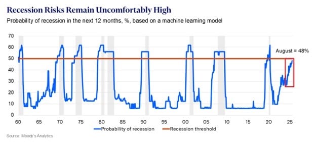 Ein Blick auf die Rezessionswahrscheinlichkeit zeigt ein Bild, das man nicht ignorieren sollte. Laut Moody’s Analytics liegt die Wahrscheinlichkeit für eine US-Rezession in den kommenden 12 Monaten aktuell bei 48 %. Das ist knapp unter der kritischen 50 %-Schwelle und historisch betrachtet hat dieser Bereich schon oft ausgereicht, um tatsächlich in eine Rezession zu rutschen.