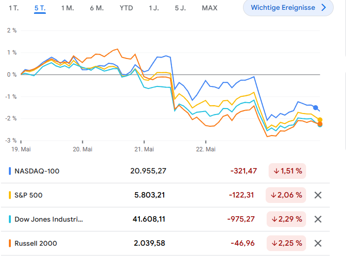 Wie schon angedeutet sind die Indizes in der vergangenen Handelswoche etwas negativer geschlossen. Wir haben uns relativ lange um die 5.850 bis 5.950 gehalten, bis wir dann mit der Zoll Ankündigung gegen Europa ruckartig gefallen sind. DIes könnte in kommender Woche anhalten, bis wir an unsere relevanten Marken gekommen sind.