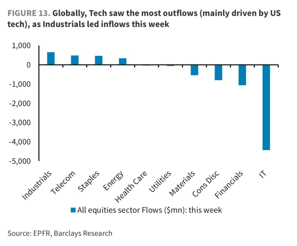 Die Grafik zeigt, dass in der vergangenen Woche unfassbar viel Volumen, im Vergleich zu den anderen Sektoren, abgezogen worden ist. Im Gegensatz dazu, führten die Industriewerte mit Zuflüssen an, gefolgt von Telekomunikation, Konsumgütern und Energie + Wasser.