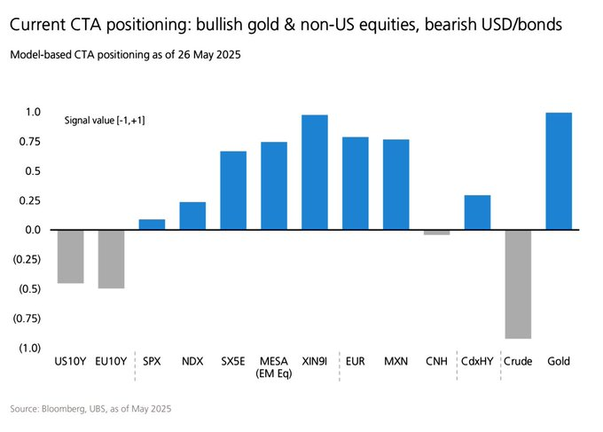 CTAs sind per 26. Mai klar bullish auf Gold und Nicht-US-Aktien – insbesondere China, Emergin Markets und den EuroStoxx50. Auch der Euro und der mexikanische Peso sind h. US-Aktien werden hingegen nur leicht positiv bewertet. Deutlich bearish sind CTAs bei Staatsanleihen (US/EU) und High-Yield-Credit, was auf Zinserwartungen und Risikoaversion gegenüber Anleihen hindeutet. Insgesamt zeigt die Positionierung: Fokus auf globale Aktien und Gold, Abbau von USD- und Bond-Risiken.