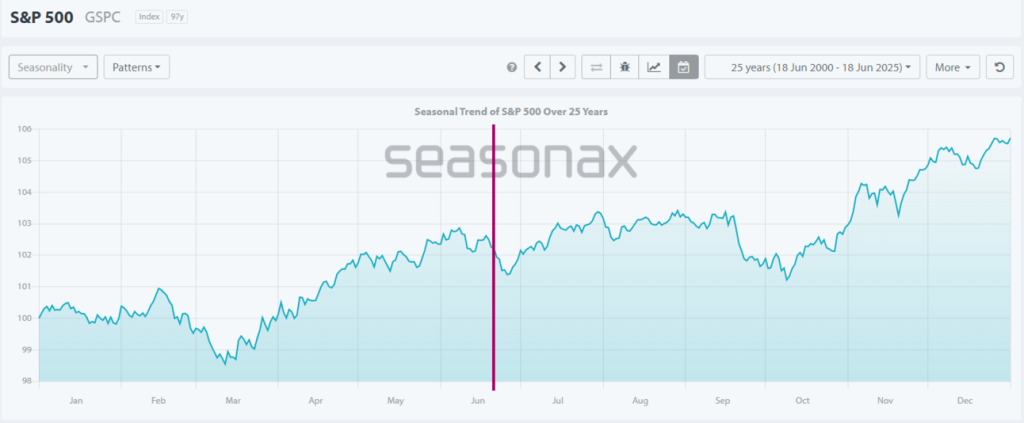 Diesmal habe ich euch die Saisonalität von einer anderen Software mitgebracht. In der aktuellen Grafik seht ihr den durchschnittlichen Verlauf der vergangenen 25 Jahre. Wenn wir uns an dieser orientieren, folgt Ende Juni eine kurzfristige Bodenbildung. Bis dahin könnten die Indizes (Nasdaq, S&P und DOW) noch etwas durchatmen. Ob und vor allem wie wir die Chancen dann nutzen werden, erfahren unsere Member natürlich immer direkt in der Community