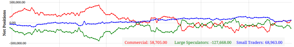 Das Zusammenspiel aus extremen Shorts bei den “Large Speculators” und den Longs bei den “Small Traders” deutet auf etwas höhere Volatilität und einer möglichen scharfen Gegenreaktion bei News hin.