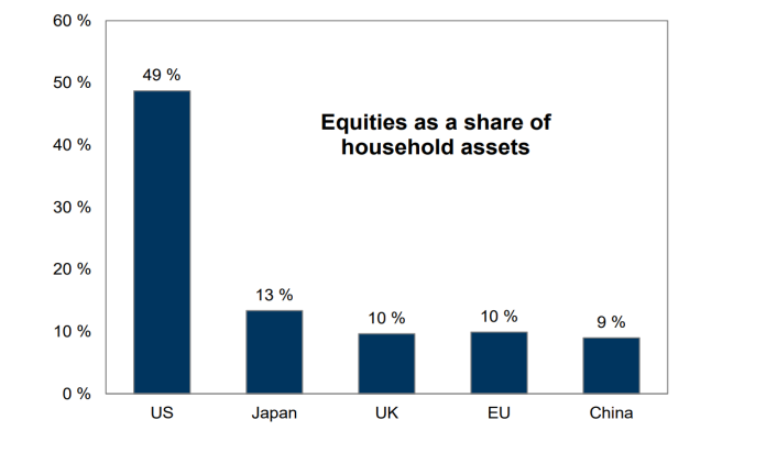 US-Haushalte haben mit fast 49% die Hälfte ihres Vermögens in Aktien investiert. In den anderen großen Wirtschaftsräumen liegt dieser Anteil dagegen nur bei rund 9-13% (Japan 13%, UK 10%, EU10% und China 9%).