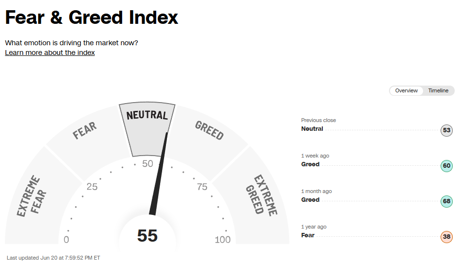 Der Fear & Greed Index ist im laufe der Woche etwas gesunken. Der Wert ist von 60 (Vorwoche) auf 55 gesunken. Dies deutete auf zunehmende Skepsis der Marktteilnehmer hin. Vor allem die Konflikte im Nahen-Osten sorgen für Bedenken und Unsicherheit und im Endeffekt ist es genau das, was diesen Index bewegt.