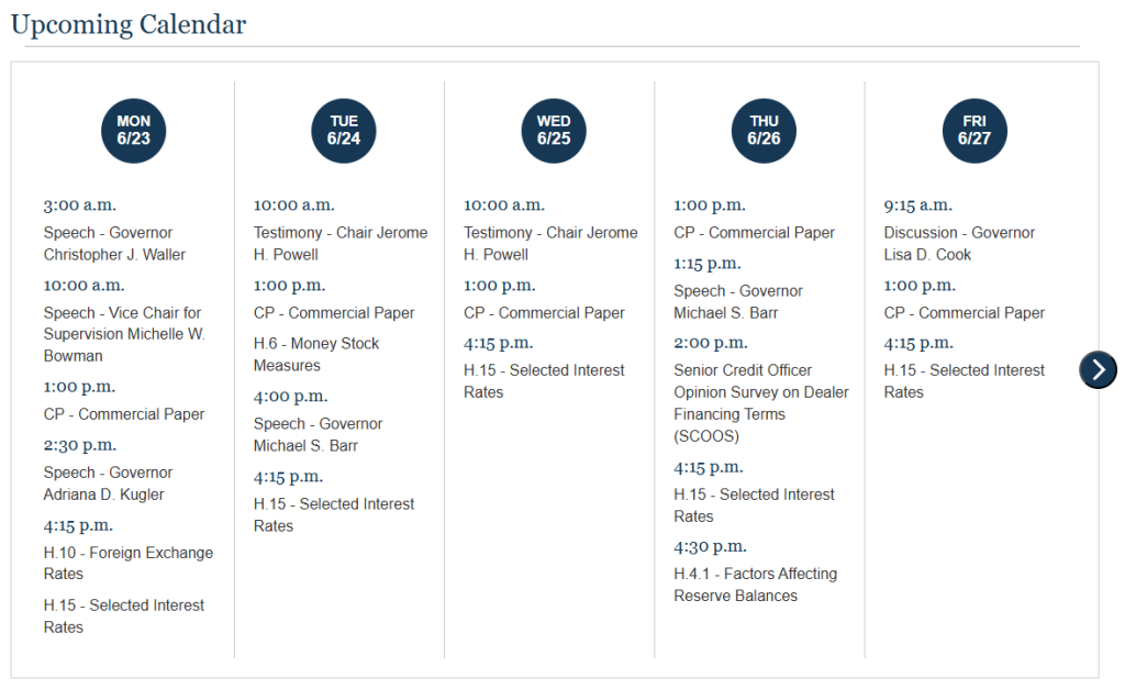 Hier habt ihr, wie gewohnt, die Übersicht der FED-Termine für die kommende Woche. Diese sind, im Gegensatz zu “MACRO-Daten und Events” nicht in der Deutschen Zeit angegeben sondern orientieren sich an der Zeitzone der FED (USA).