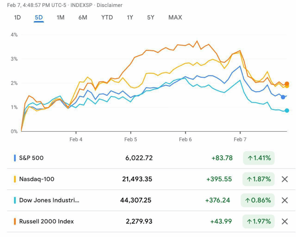 Hier die Wochenperformance der US-Indizis. Der „Drop“ am Montag ist erneut gut zu sehen sowie die seitdem aufgeholten Kursverluste. In dieser Woche war der DOW JONES der Schwächste Index aus dem Quartett.