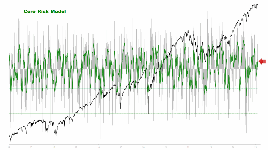 Seit letzter Woche sind wir etwas weiter angestiegen. Ist dies jetzt ein Zeichen, dass es zu einer größeren Korrektur komm? Nein. Das Risiko (wenn man dieses Model betrachtet) das eine „größere“ Korrektur folgen kann, bleibt aktuell (noch) relativ gering.