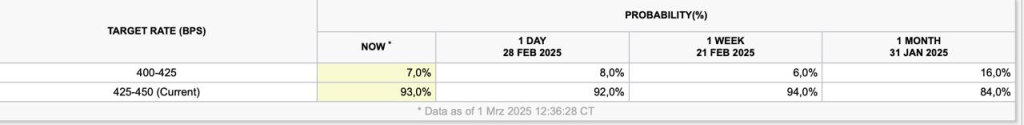 Die aktuelle Wahrscheinlichkeit einer Zinssenkung liegt bei 7% und damit stellt sich der Markt auf keine weitere Zinssenkung ein.